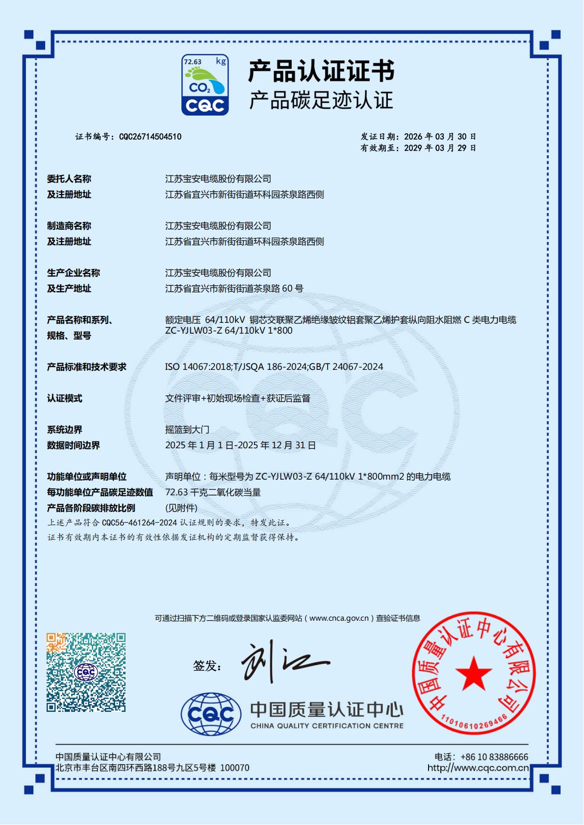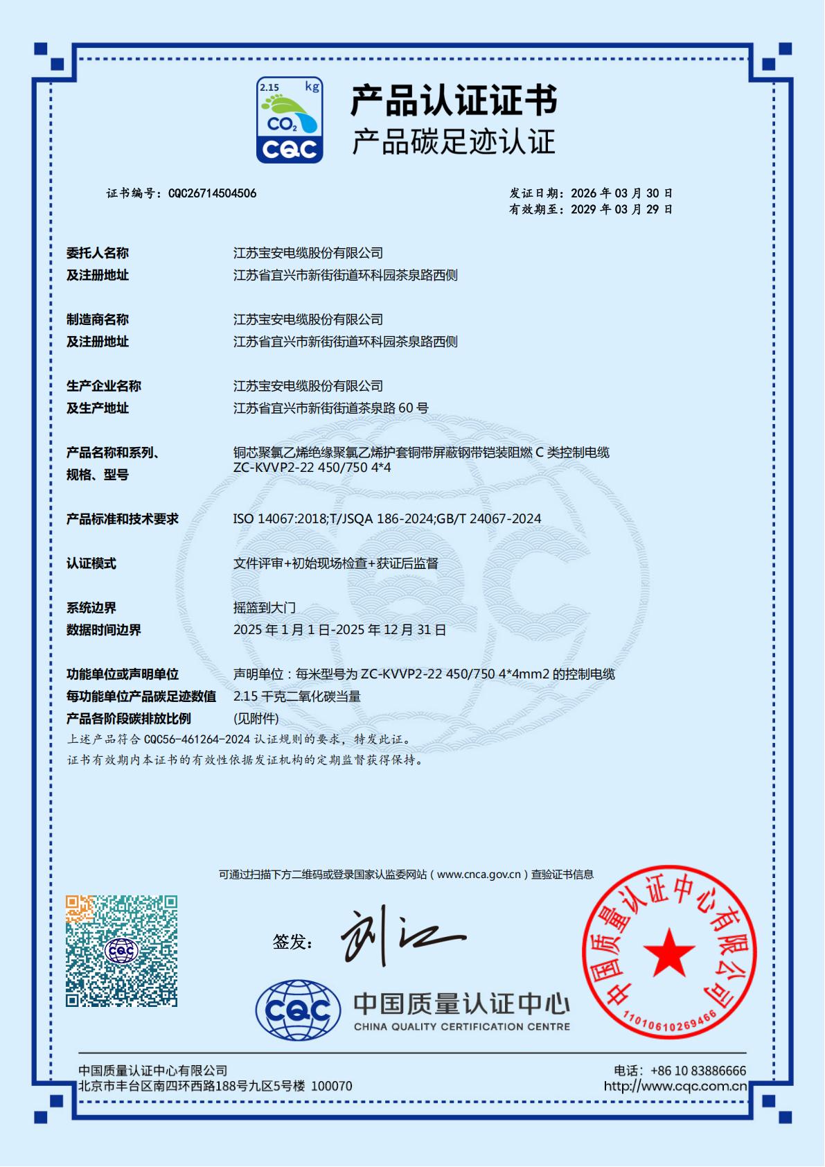 江苏宝安电缆股份有限公司产品碳足迹认证证书